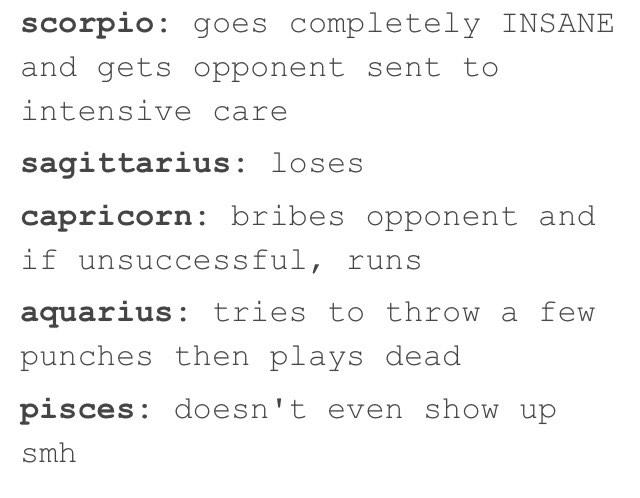 FIGHT MOVES CAPRICORN RIGHT HOOK AQUARIUS ROUND HOUSE KICK ... from pics.me.me Being one of the most passionate signs of the zodiac, their fights are passionate as well. Cancers are renowned for their sensitvity, but it is this emotional sensitivity that will help them survive. Cancers are known for their sensitivity, but it's precisely this emotionality that will benefit them in a fight. Intense and heated, taurus is brutal and grudge holding, leo provides imply feedback and takes harsh actions. Both taurus and cancer are very connected to their physical bodies, and share an intense, almost psychic, sensuality. When it comes to intimacy, cancer is a master of achieving it with the right person. Like and subscribe and also comment what you want to see nextπ π½π. The cancer's mood swings are beyond measure or expression, and their emotions have no filter or boundary and get overbearing.